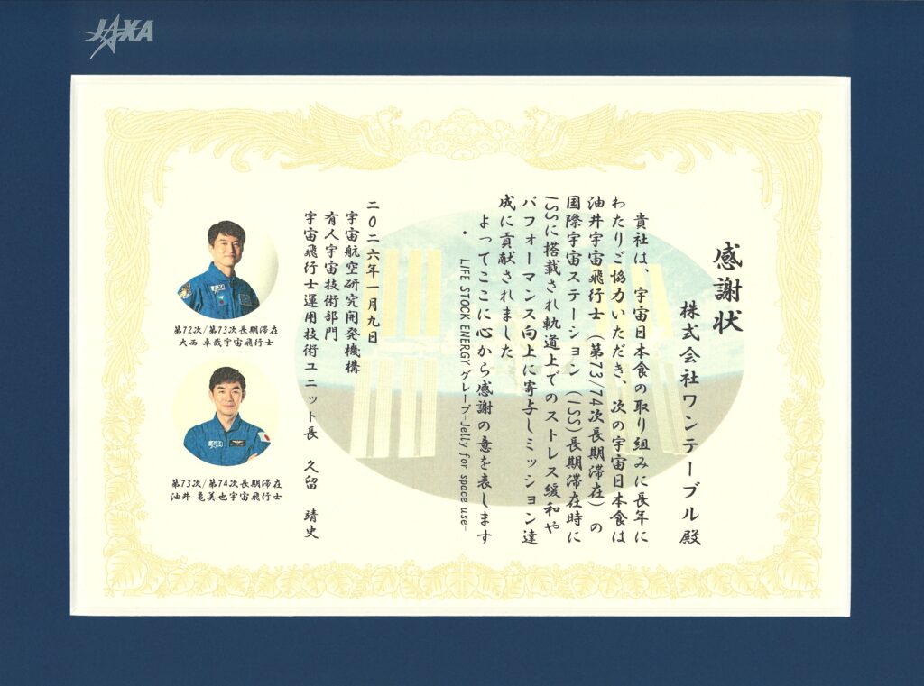 このたび、宇宙日本食として認証されております弊社の「LIFE STOCK ENERGY グレープ-Jelly for space use-」が、 国際宇宙ステーション(ISS)長期滞在時の宇宙飛行士のストレス緩和やパフォーマンス向上に寄与し、ミッション達成に貢献したとして、 宇宙航空研究開発機構(JAXA)より、感謝状を拝受いたしました。